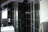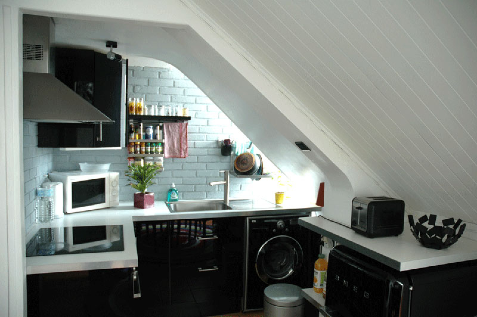L'appartement comprend : une entrée avec range-chaussures mural, une cuisine ouverte équipée (plaques induction, micro-ondes, four électrique, frigo, hotte, lave-linge 1400 tr/min, meubles de rangement et vaisselle), un séjour avec table ronde, chaises, canapé-lit de 120, TV, meuble de rangement, une chambre avec lit de 140, penderie, prise téléphone/internet, et une salle d'eau avec WC attenante à la chambre (douche hydromassante, vasque sur meuble et sèche-serviette).