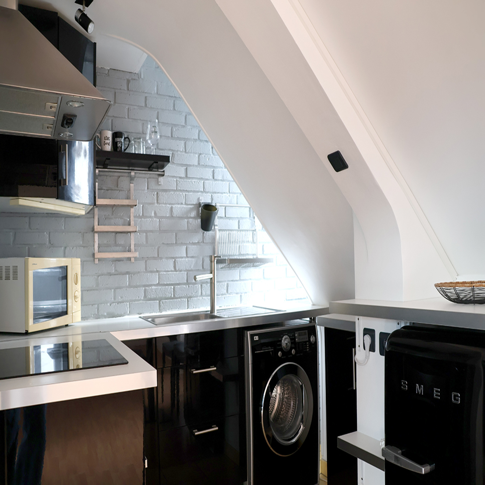 L'appartement comprend : une entrée avec range-chaussures mural, un séjour, une cuisine ouverte équipée (plaques induction, micro-ondes, four électrique, frigo, hotte, lave-linge 1400 tr/min, meubles de rangement), une chambre avec penderie, et une salle d'eau avec WC attenante à la chambre (douche hydromassante, vasque sur meuble et sèche-serviette).