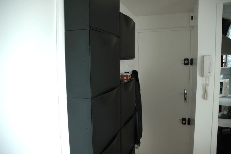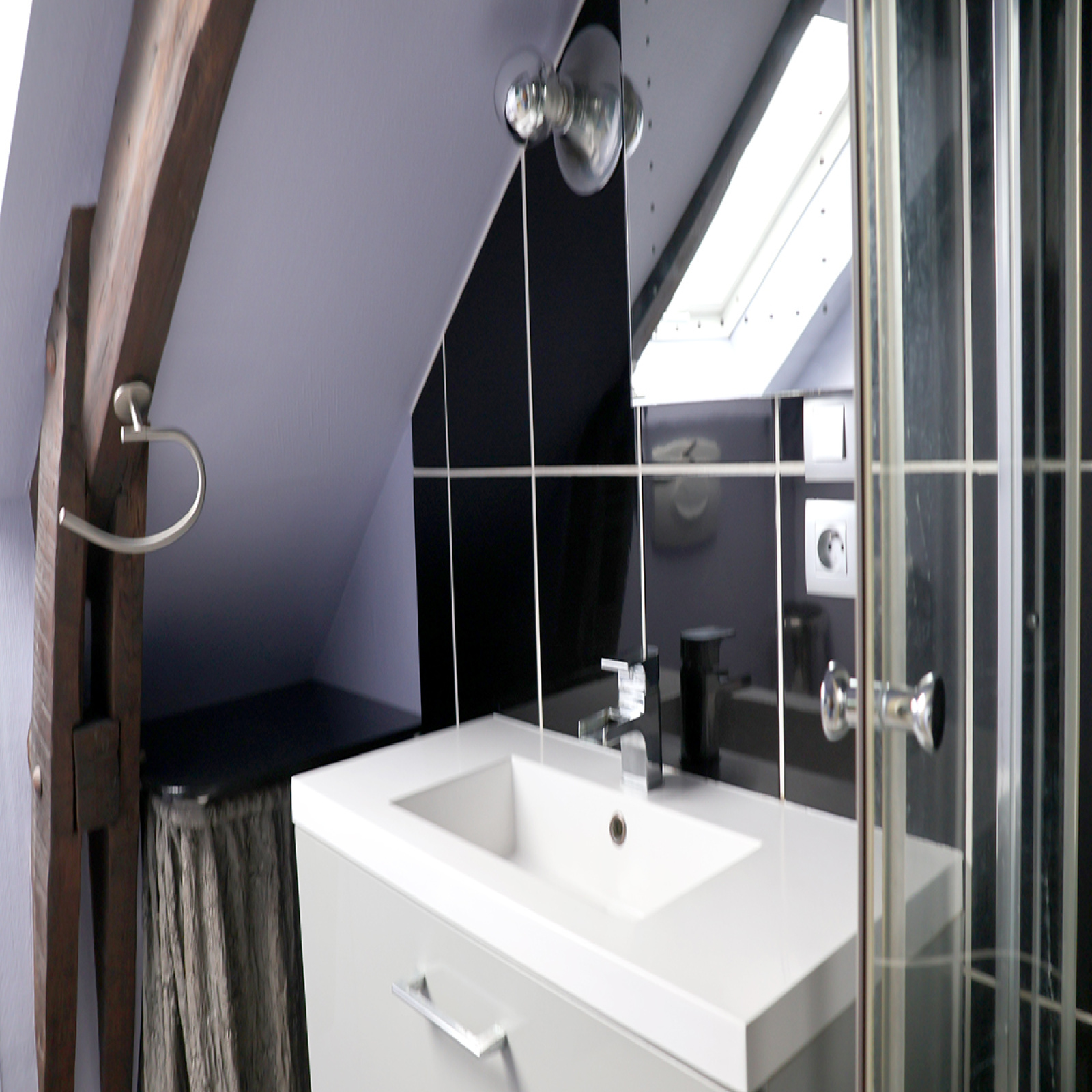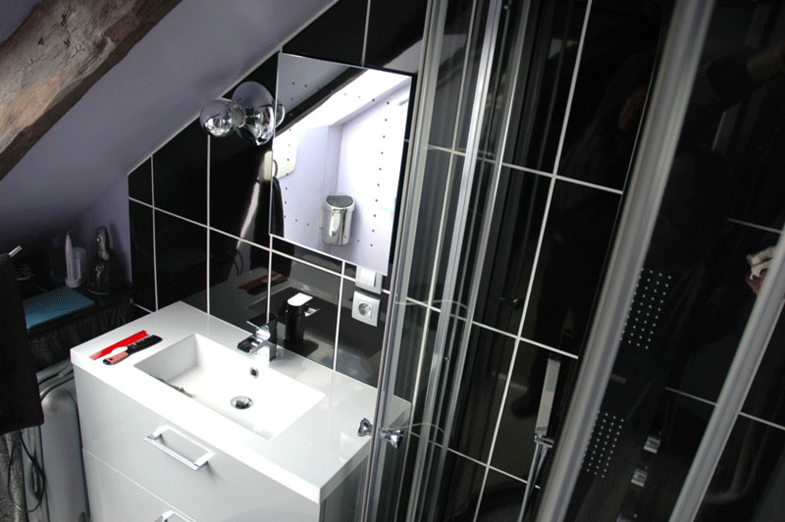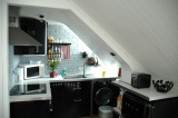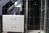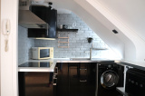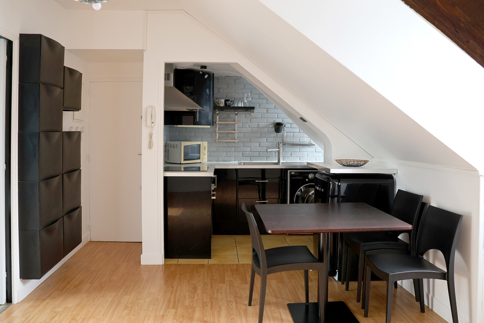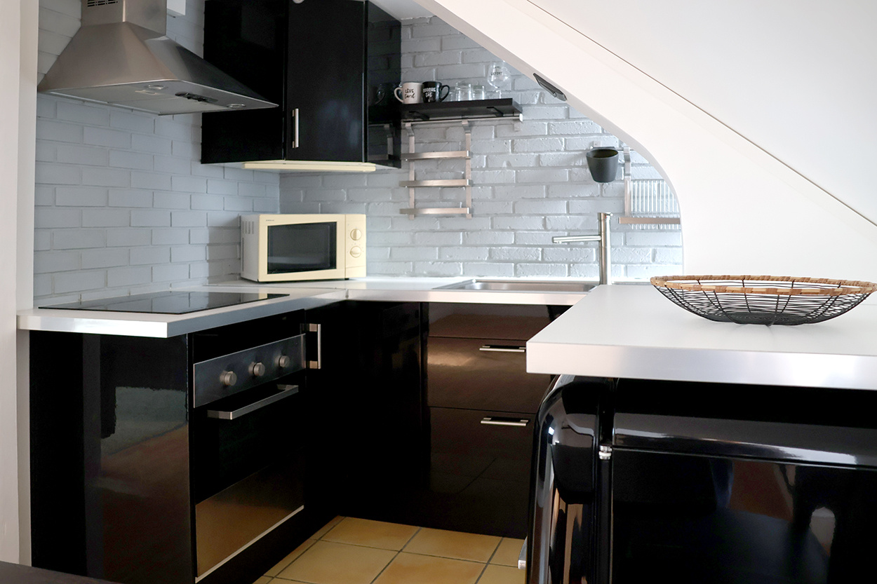 L'appartement comprend : une entrée avec range-chaussures mural, un séjour, une cuisine ouverte équipée (plaques induction, micro-ondes, four électrique, frigo, hotte, lave-linge 1400 tr/min, meubles de rangement), une chambre avec penderie, et une salle d'eau avec WC attenante à la chambre (douche hydromassante, vasque sur meuble et sèche-serviette).