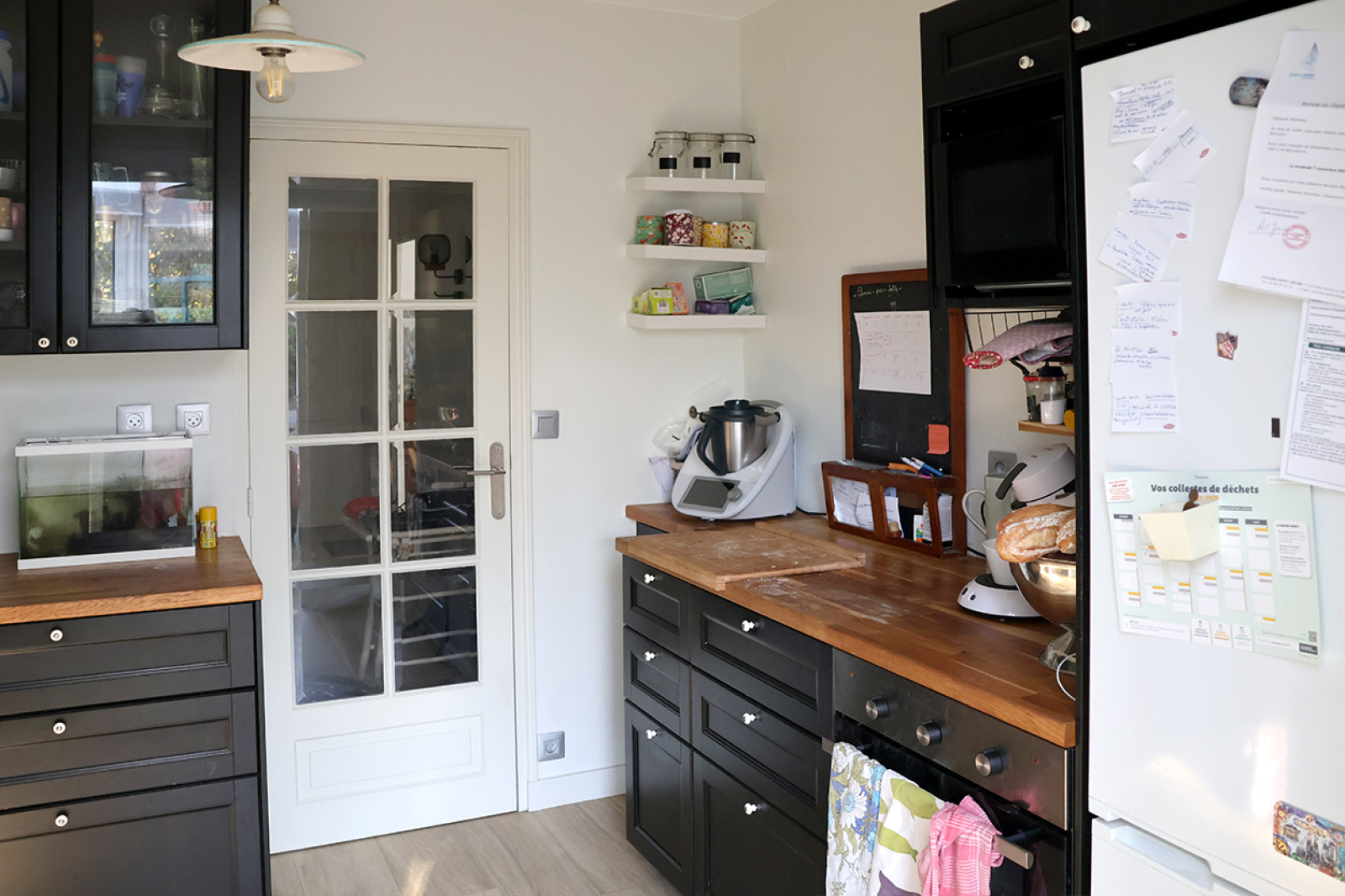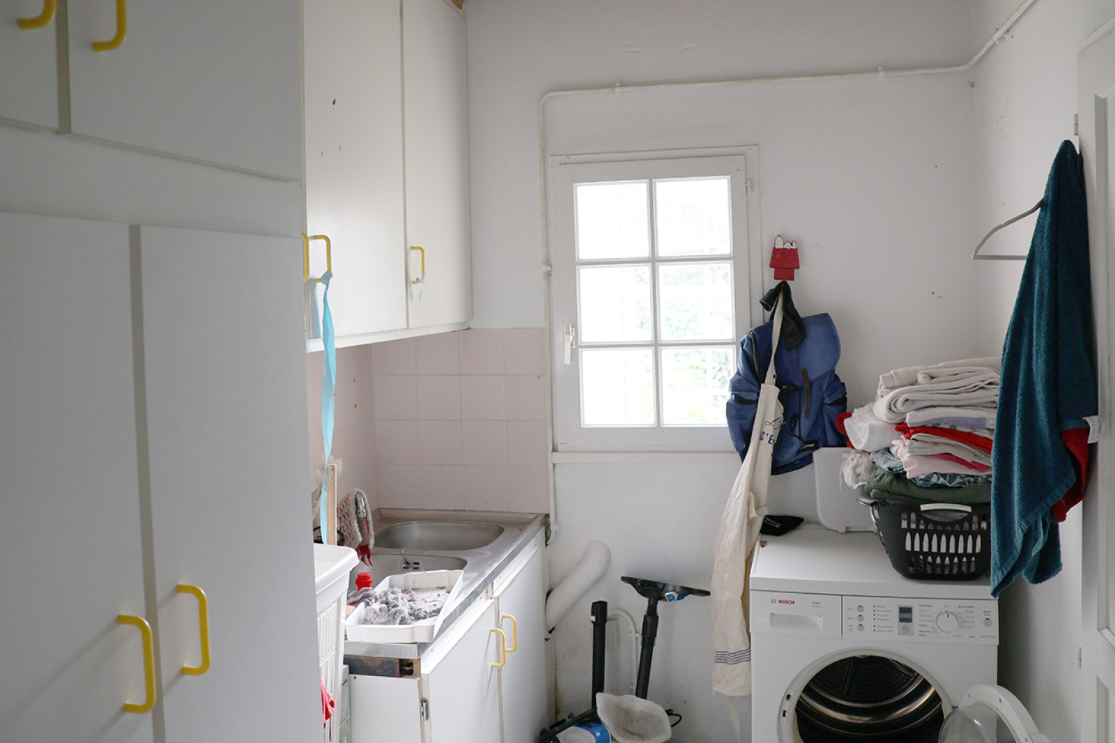 - Au RDC : hall d'entrée avec cage d'escalier, placard de rangement, cuisine donnant sur une véranda, une grande pièce de vie comprenant salle à manger et 2 coins salons avec cheminée, un WC avec lave-mains séparé, une chambre/bureau avec plusieurs placards, un double garage et une buanderie avec évier ;